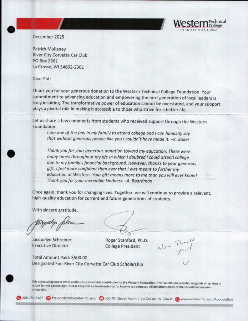To receive more information about the River City Corvettes Scholarship Program or to make a donation please fill out this form.